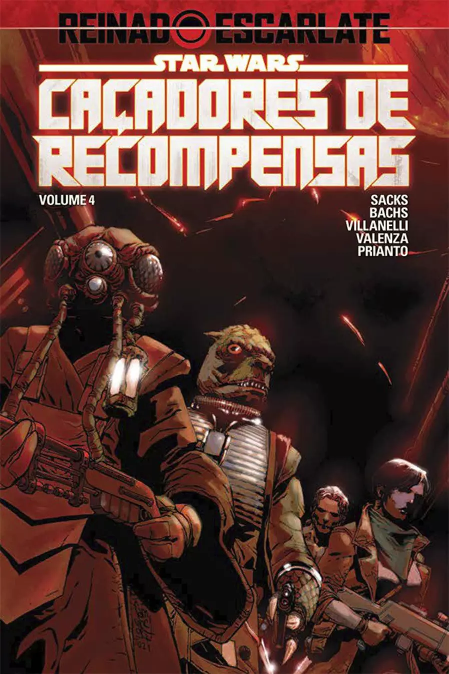 Na esteira dos eventos chocantes da Guerra dos Caçadores de Recompensas, o submundo tornou-se mais perigoso que nunca. T’onga reune o maior esquadrão de assassinos de aluguel da galáxia – incluindo Bossk, Zuckuss e Tasu Leech – para uma missão especial! Mas, enquanto T’onga lamenta a perda de um velho amigo, será ela capaz de impedir que os mercenários matem uns aos outros e se tornem um time de verdade? Tomara, pois a Aurora Escarlate vem conduzindo a galáxia a um conflito generalizado, e essa equipe improvável está ficando sem tempo para salvar a garotinha que pode impedir o confronto entre sindicatos! Simultaneamente, um misterioso caçador de recompensas pretende eliminar um alto oficial imperial a bordo de um cruzador pesadamente armado. Mas… será que ele está mesmo no rastro do alvo certo?